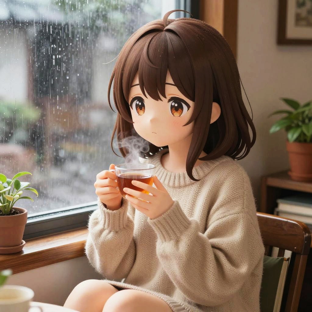 Anime-style digital illustration: Cute girl with short brown hair observes coffee plant with green leaves and red cherries beside coffee cup. Speech bubbles show her thoughts