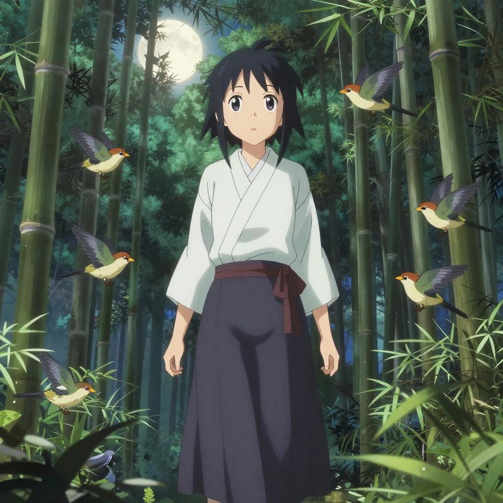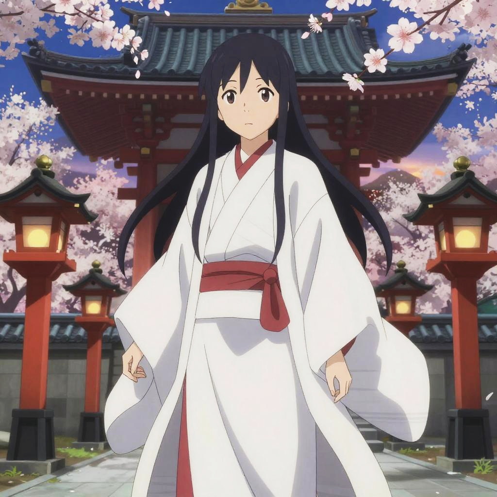 Suzume no Tojimari Daijin depicted as a mystical, traditional Japanese deity cloaked in flowing robes, surrounded by cherry blossoms and ancient temple gates under a twilight sky.