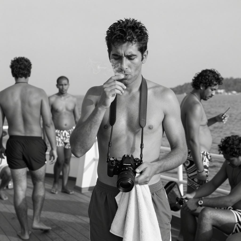 Black-and-white photograph of a beach scene. Shirtless man with curly hair in front, holding towel, intense expression. Four people in swimsuits sitting on lounge chairs in background. One man bending over, another with striped shirt standing, two women in bikinis. Pier and boats in background. Umbrella with fringed edge on right.