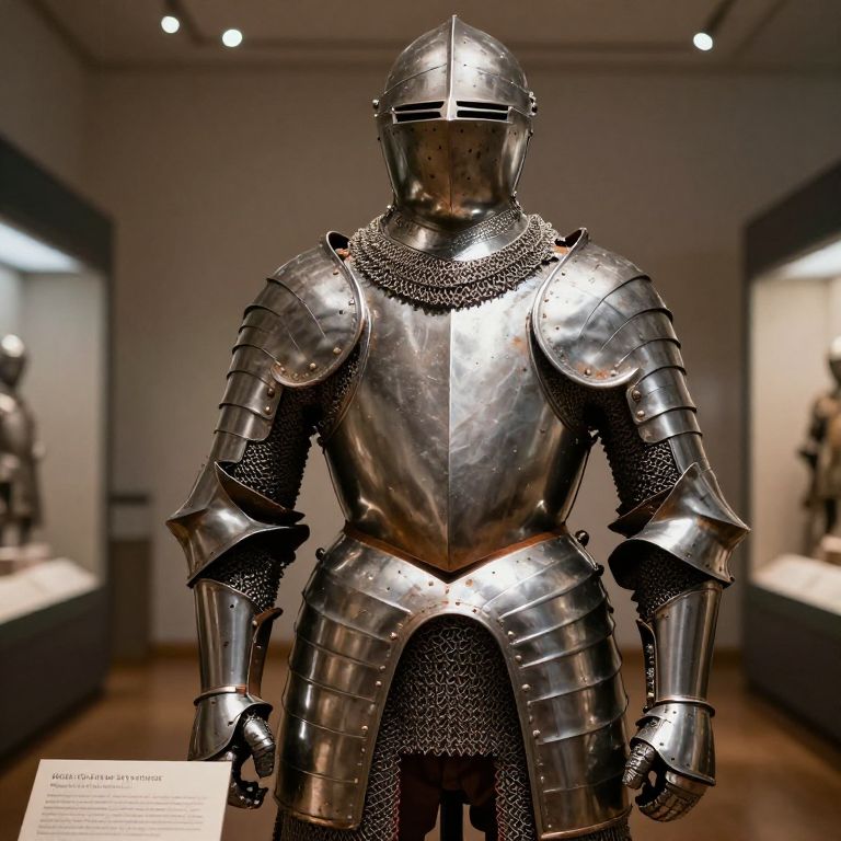 Realistic knight armor displayed in a museum setting with soft overhead lighting, detailed plates and chainmail visible, subtle rust and wear from age, a historical informational plaque beneath, backgrounds softly blurred to emphasize the armor's craftsmanship.