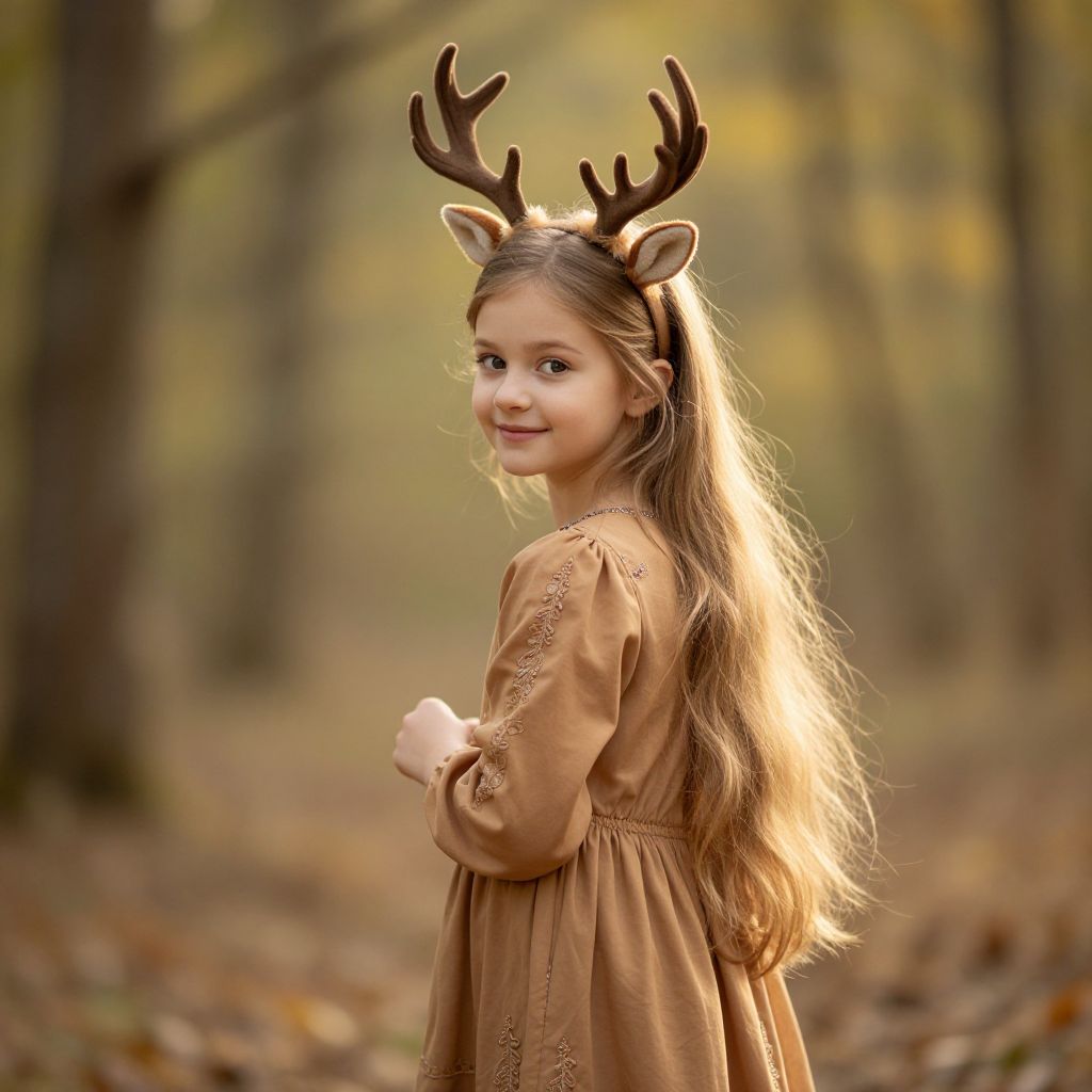 A beautiful young girl with long, flowing blonde hair that cascades down her back, wearing a soft, elegant brown dress with delicate embroidery. She wears a charming deer headband on her head, featuring a detailed antler design and a soft, natural hue that complements her warm, inviting expression. She stands in a peaceful forest setting, sunlight filtering through the trees, with a serene and joyful atmosphere around her. The image captures her innocent charm and natural beauty, blending nature and fashion in a harmonious, dreamy scene.