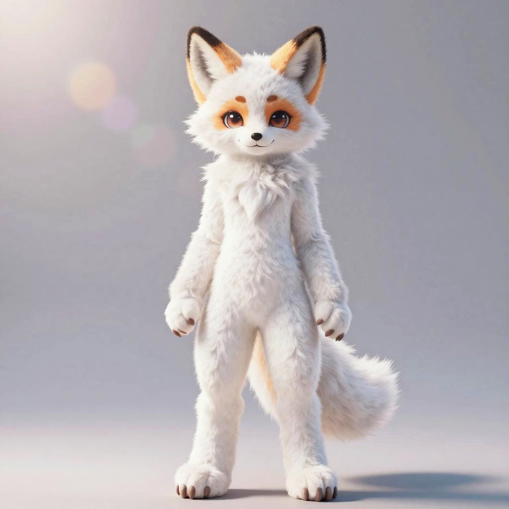 RAW photo, uhd, dslr, high quality, realistic, photo realistic, dreamlikeart, lens flare, standing, upper body, looking at viewer, animal focus, furry, fursuit, 1girl, fox, cute, kawaii, lovely, fur, fur head, narrow waist, fox ears, paw, paw shoes, white fur, slim body, flat chest, thigh gap