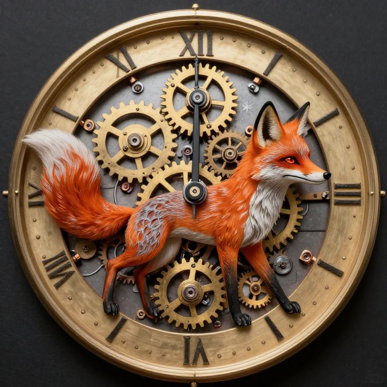 Amidst the celestial dance of time, a clockwork fox whispers the secrets of eternity through its gears, embodying the paradox of freedom within the bounds of precision.