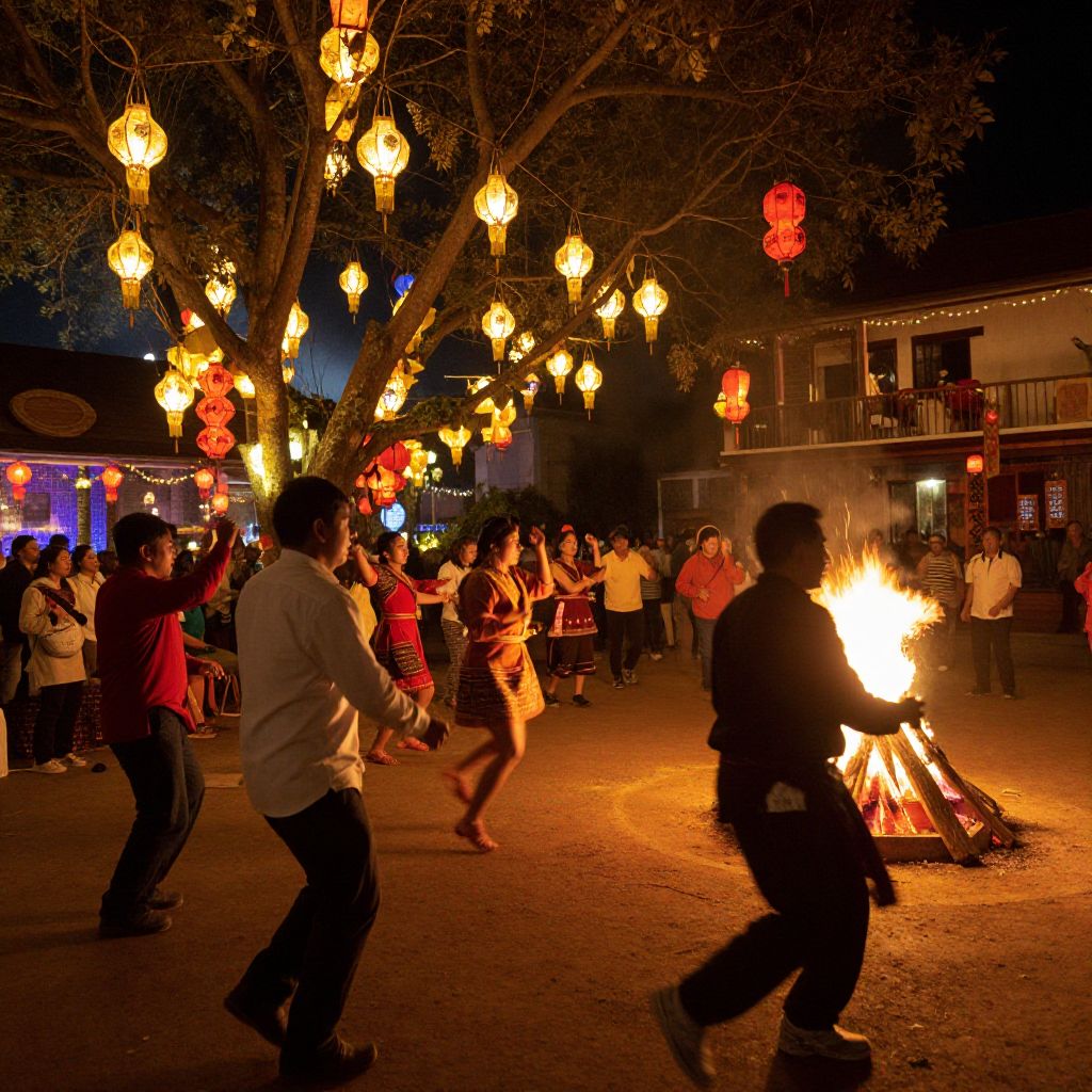 Nighttime photograph of a lively outdoor lantern festival, with people dancing around a fire pit, surrounded by glowing paper lanterns and festive lights.