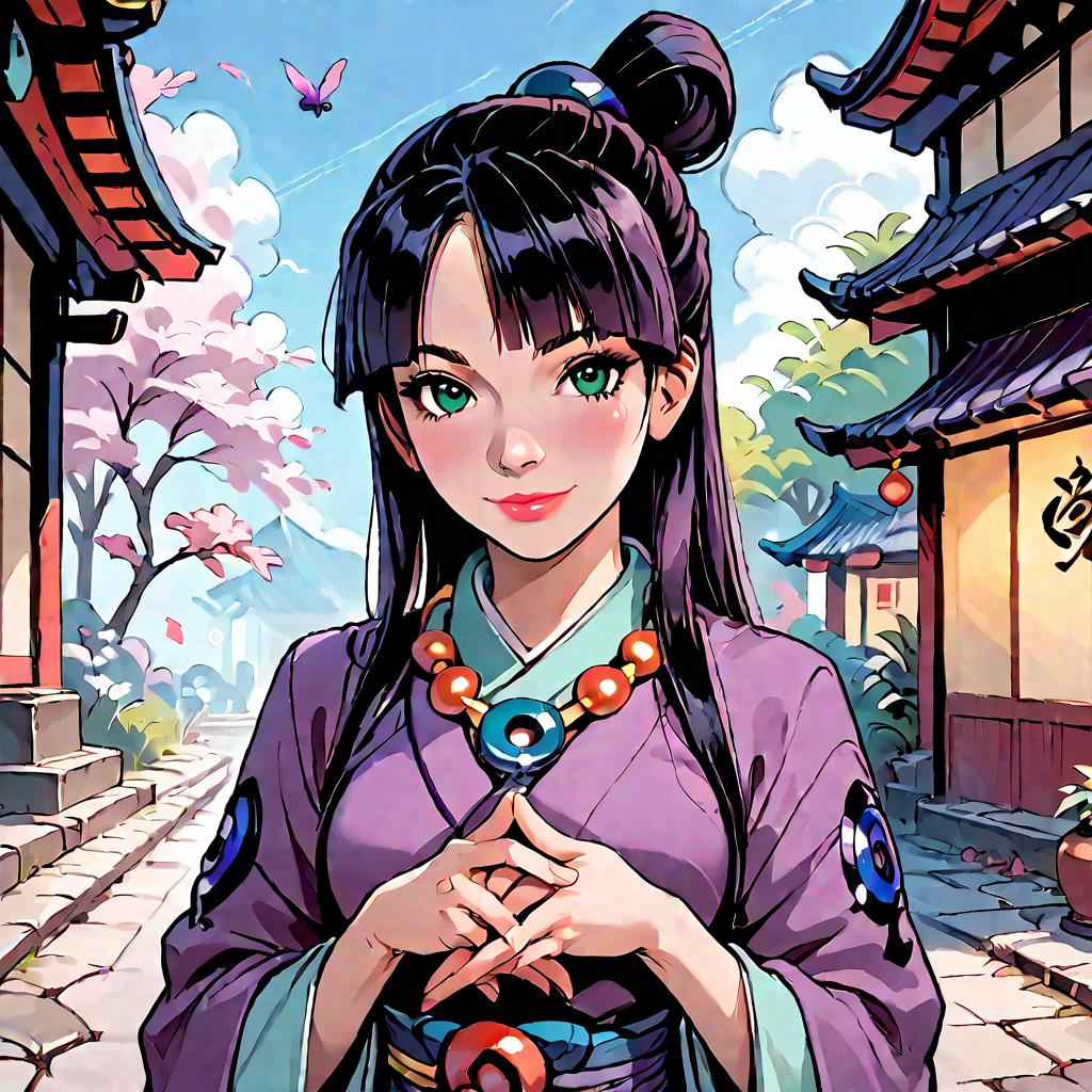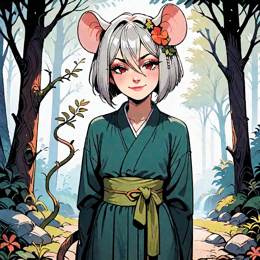 Score_9, score_8_up, score_7_up, score_6_up, score_5_up, score_4_up, source_anime, outside, forest, moss, vine, rock, front view, (hair between eyes:1.1), red eyes, looking at viewer, smile, smug, narrowed eyes, solo, female, humanoid, mouse humanoid, tail, bob cut, grey hair, flat chested, green kimono, green sash, flower in hair, standing, hands behind back