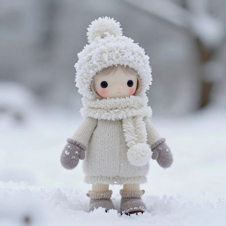 A close-up of a delicate porcelain doll with a blue floral outfit and a red silk scarf wrapped around its neck, its large expressive eyes gazing softly toward the camera. The doll wears a white velvet hat adorned with a soft, fluffy pom-pom on top, giving it a gentle, whimsical charm. The lighting is soft and warm, highlighting the smooth texture of the doll's features and the subtle details of the fabric. The background is gently blurred, creating a dreamy, nostalgic atmosphere that emphasizes the doll's delicate presence.