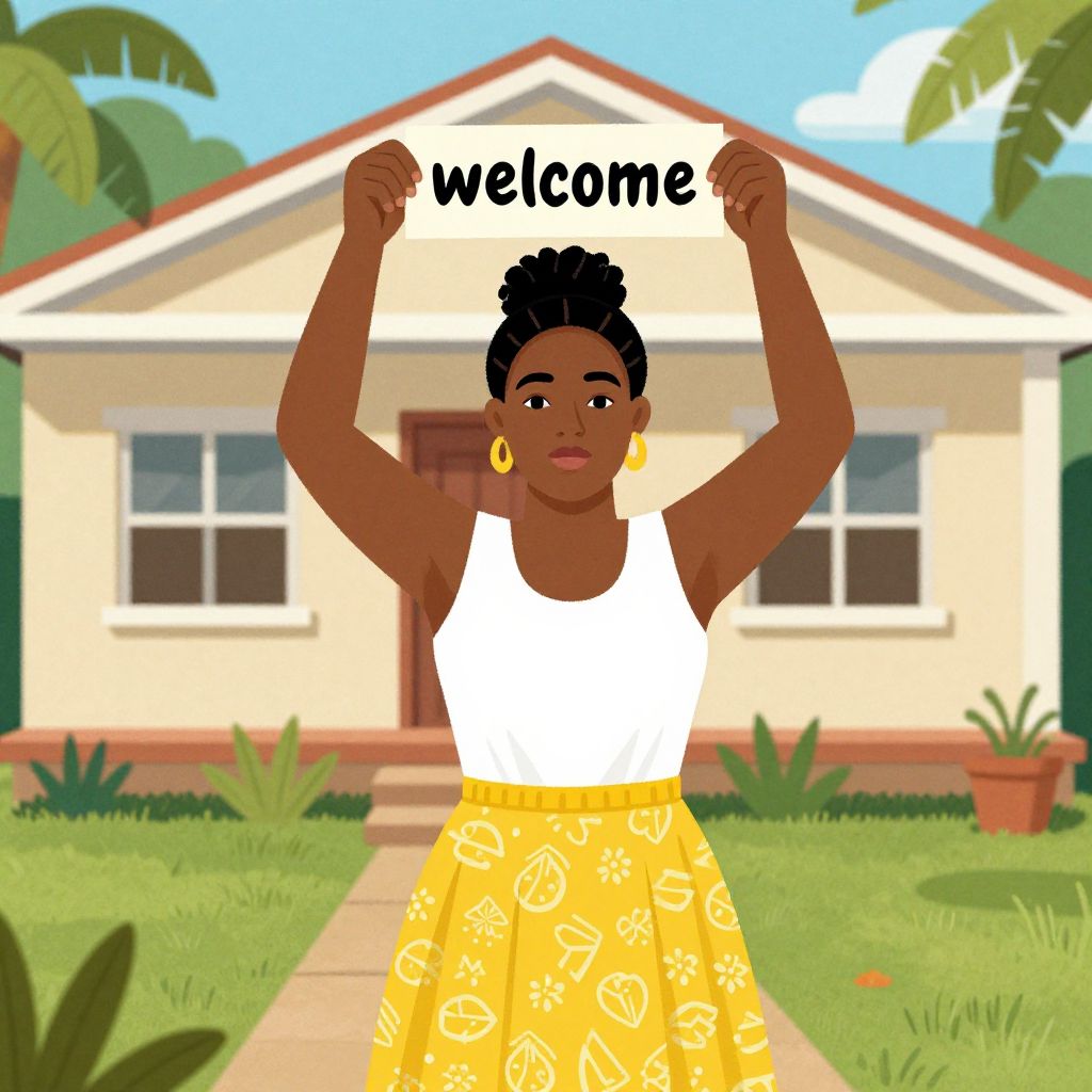 \"Illustration of a Trinidadian woman raising her arms as if to say \"\"welcome\"\" in front of a house.\