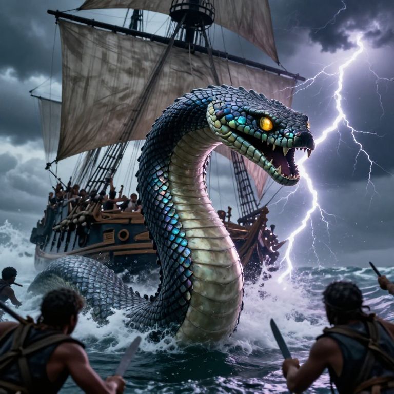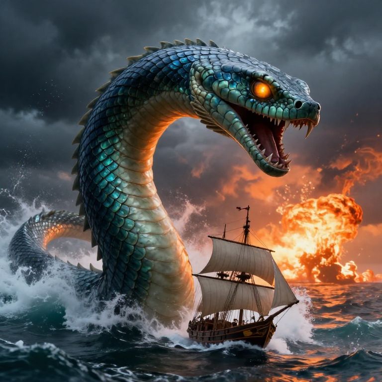 Highly detailed and dramatic digital artwork featuring a dramatic scene at sea, The layout is dynamic, with a massive sea serpent emerging from turbulent waters, its scales glistening in shades of blue and green, The creature's eyes glow ominously, and its mouth is open wide, revealing sharp teeth, In the foreground, a small sailing ship is dwarfed by the serpent, its sails billowing in the stormy wind, The background features a fiery explosion on the water, casting an orange glow against the dark, stormy sky, The overall color palette is a mix of dark blues, grays, and fiery oranges, creating a sense of tension and danger, The image is highly detailed, with realistic textures on the serpent's scales and the churning sea, enhancing the sense of realism in this fantastical scene