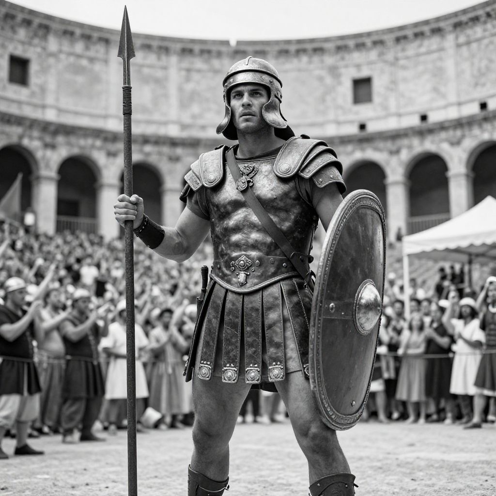 Black-and-white photo of a muscular male gladiator in Roman armor, holding spear and shield, standing in a crowded ancient coliseum.