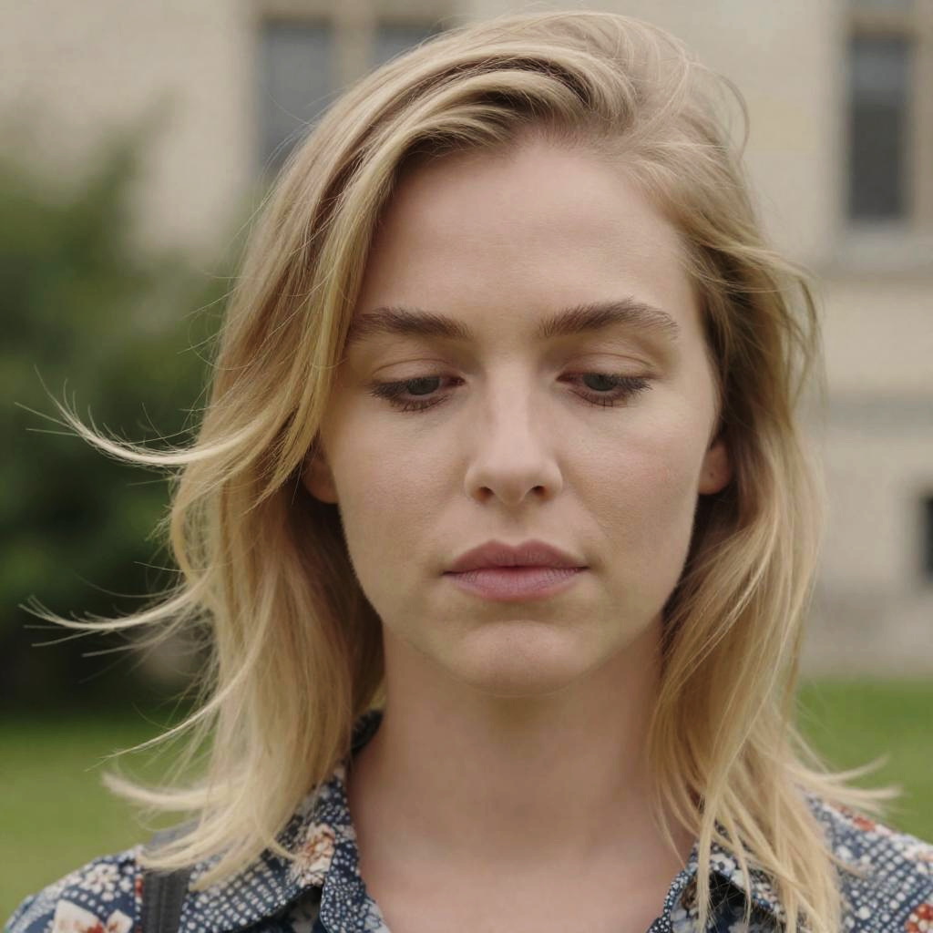 Photograph of a blonde woman with light skin, intense expression, hands near her mouth, partially obscured by a dark-haired person. Low-angle shot, blurred background, white border with and at bottom. Two people.