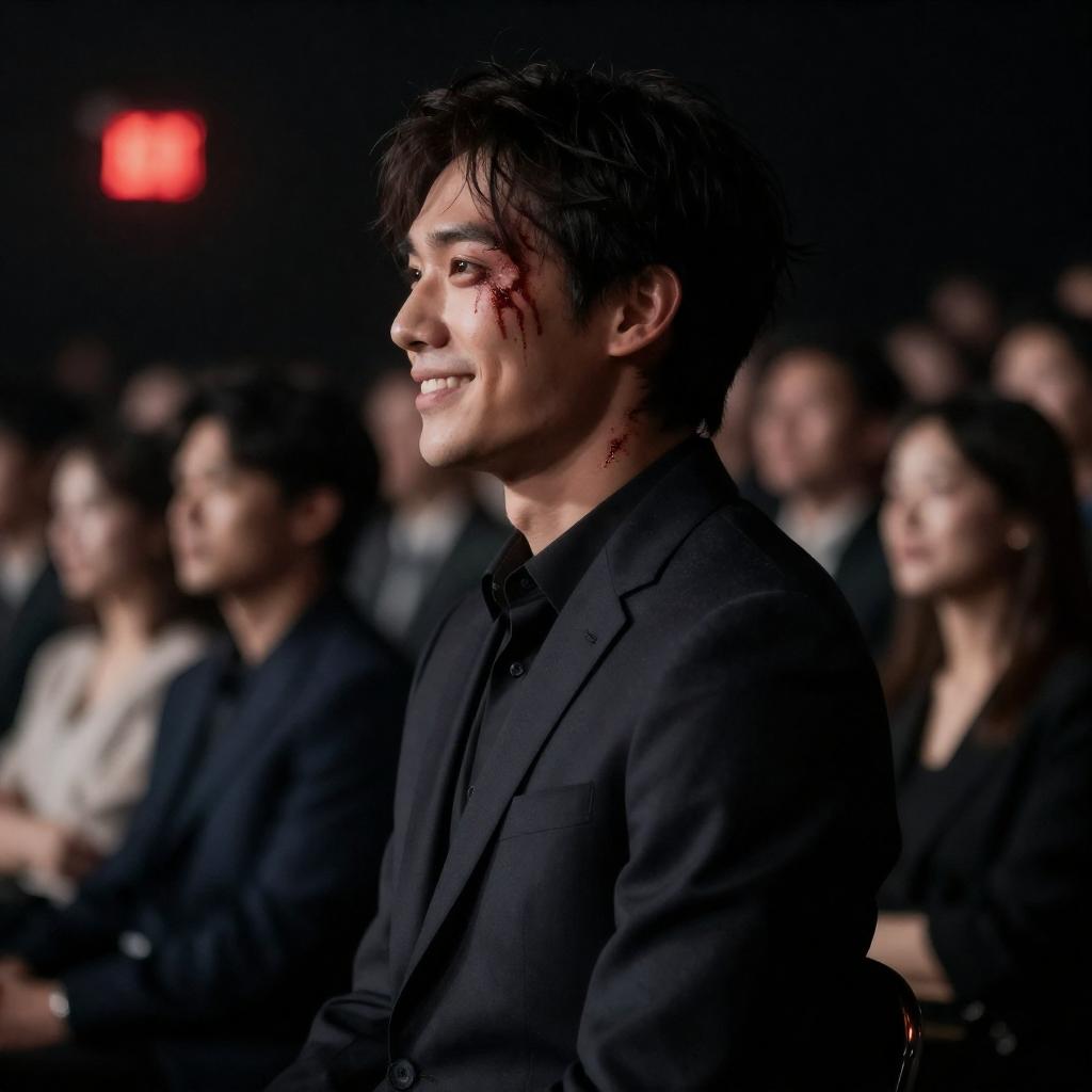 Male with blood-stained face and disheveled hair in dark suit, side profile, smiling. Background: dimly lit audience, blurred faces. Red exit sign on left. Dark, moody atmosphere.