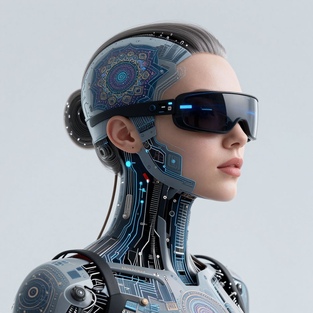 Digital artwork of a cybernetic woman with a futuristic hairstyle, intricate circuitry on her head and neck, black sunglasses, and a pale skin tone