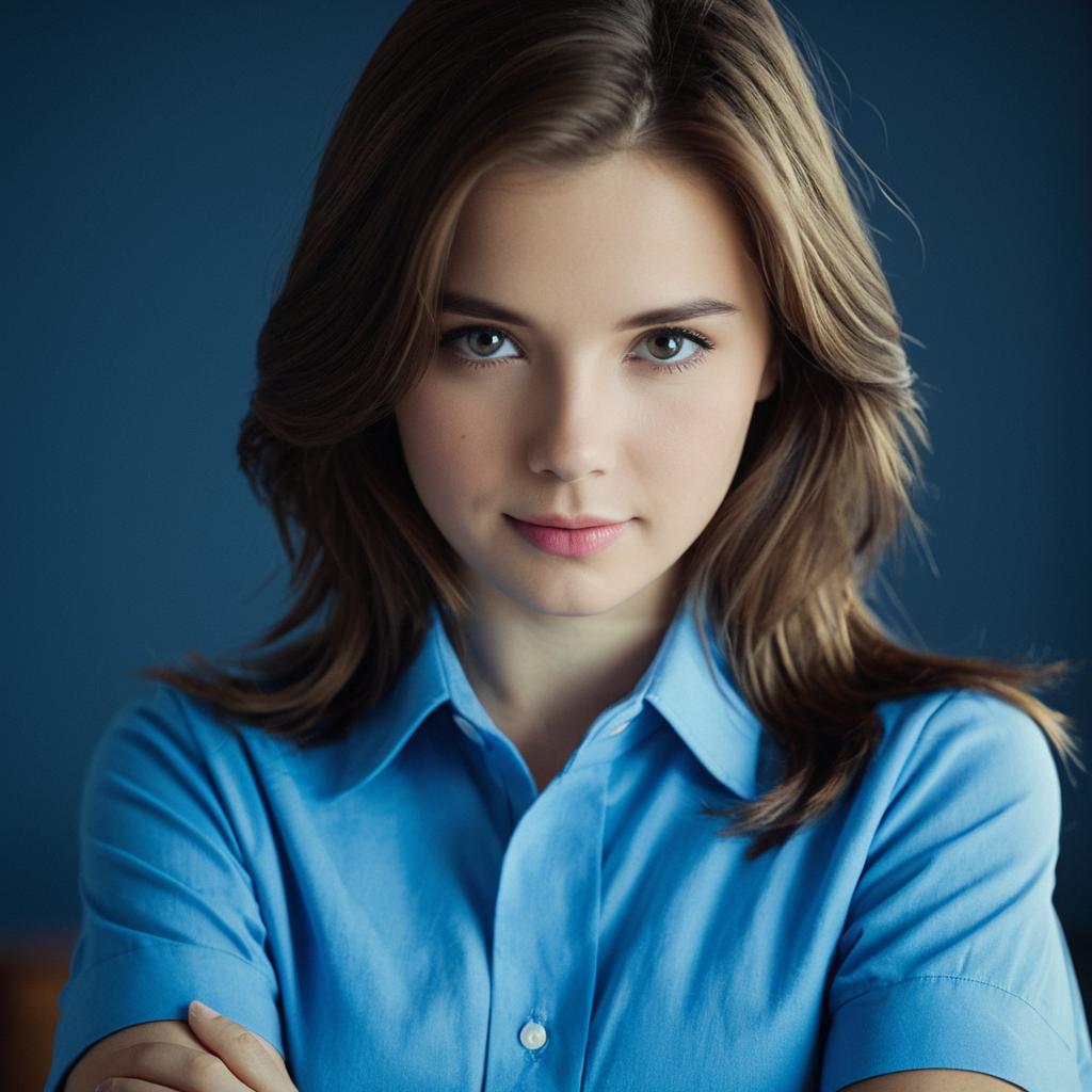 Portrait of a young woman with long auburn straight hair, blue eyes, and natural makeup. She is wearing a light blue shirt and a gold necklace featuring a blue gemstone pendant. The background is dark, emphasizing her facial features and jewelry.