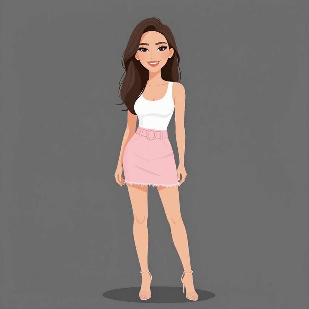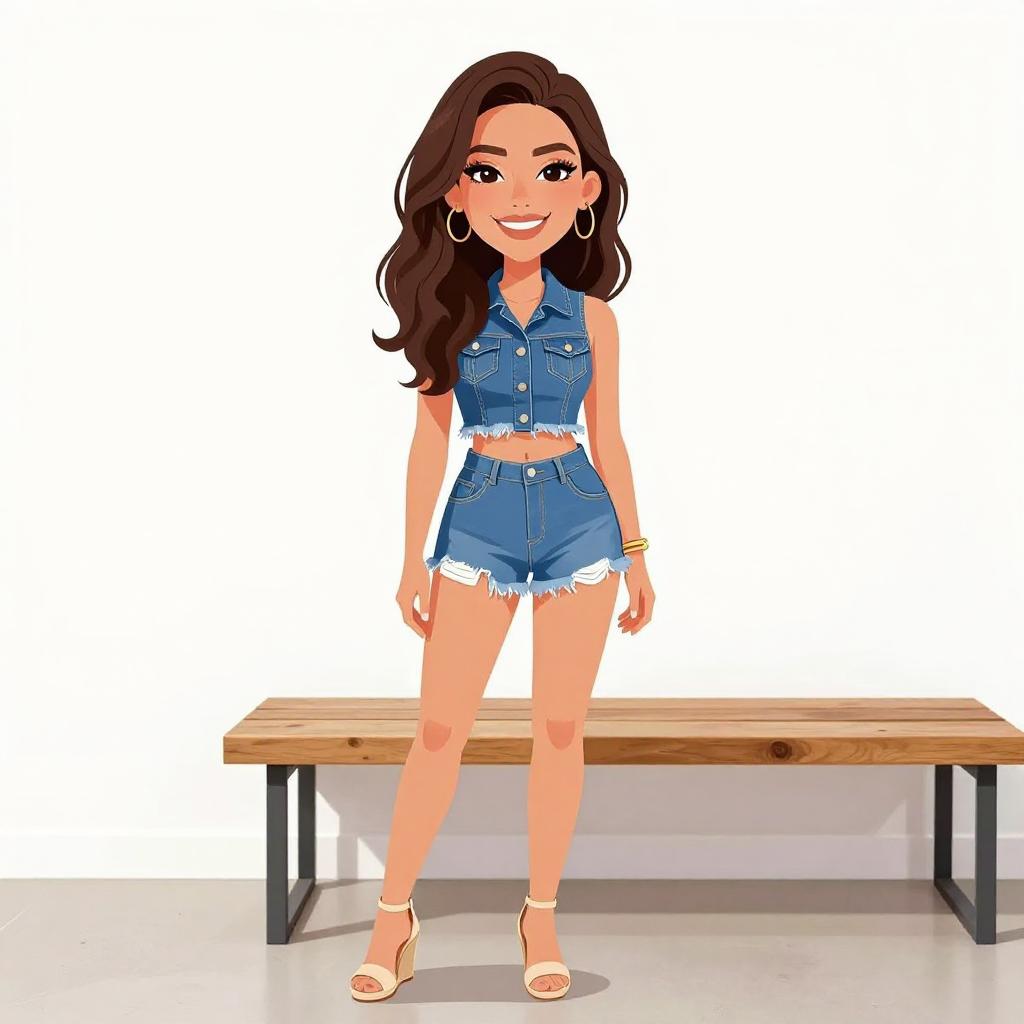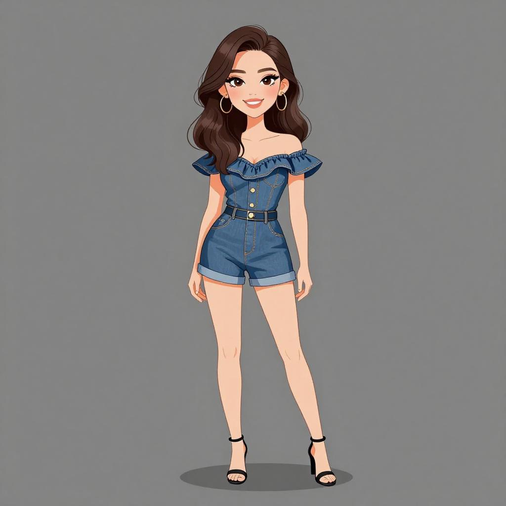 Digital illustration of a young woman with long brown hair, wearing an off-shoulder blue denim romper, black high heels, and hoop earrings,