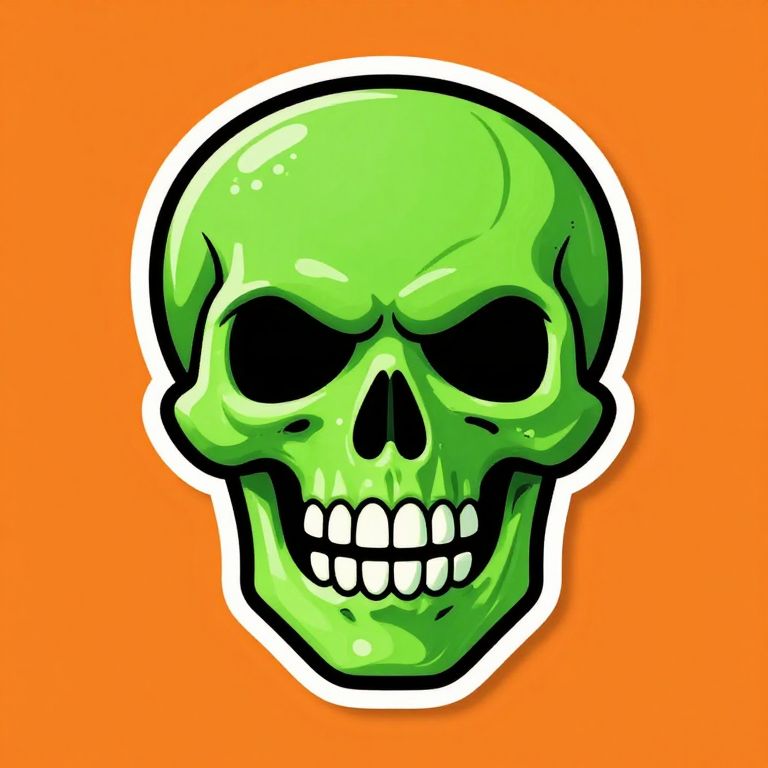 The image features a cartoon skull sticker with a vibrant green color, set against a solid orange background. The skull is depicted in a stylized, exaggerated manner, with a wide, menacing grin and large, dark eyes that convey a sense of malevolence. The sticker has a glossy, almost metallic sheen, giving it a three-dimensional appearance. The edges of the sticker are outlined in black, providing a stark contrast to the green and orange colors. The skull is positioned centrally in the image, with its mouth open wide, revealing sharp, white teeth. The overall composition is simple yet striking, with the bright green skull standing out vividly against the warm orange backdrop.
