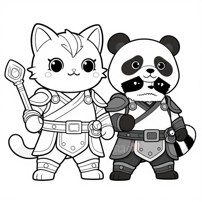 Black-and-white digital drawing of a cute, armored cat and panda standing together, both holding weapons and wearing adventurous outfits.