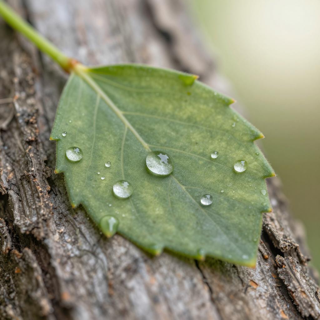 Macro close-up of dewdrops on a green leaf on rough bark texture under early morning gentle light, 8K resolution, minimalistic, bright, authentic, healthy, vibrant, photorealistic.