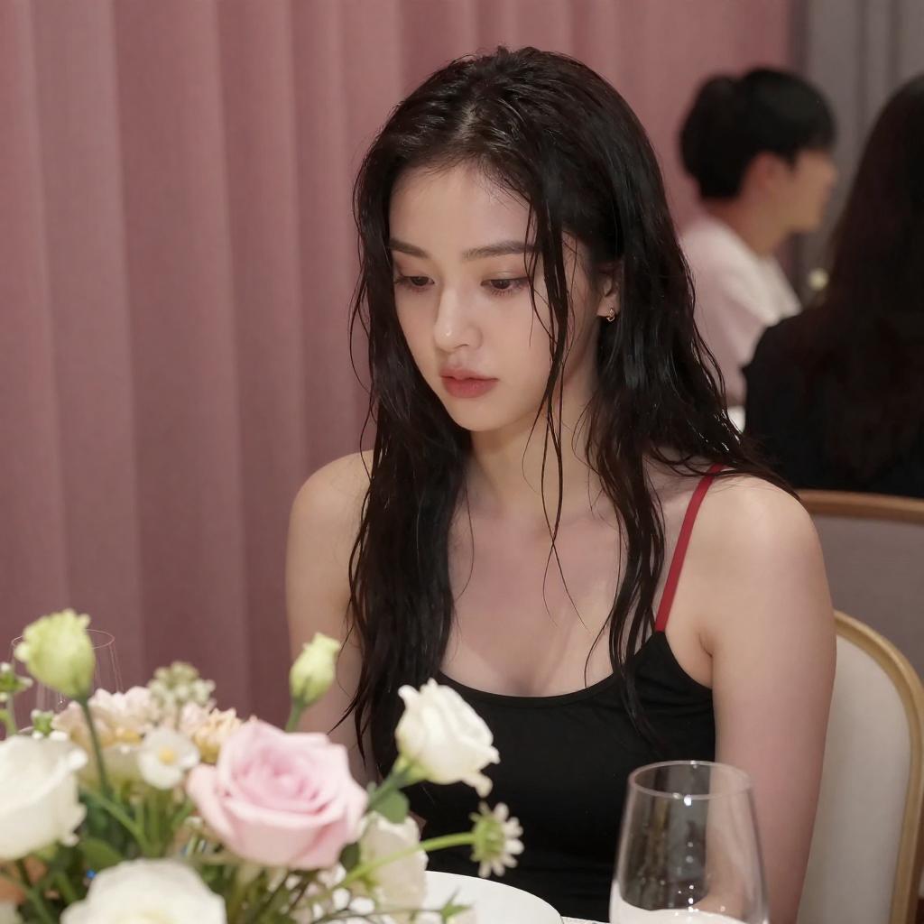 Young woman with wet, dark hair, wearing a black tank top with red strap, sitting at a table, looking down. Floral arrangement in front, glassware around. Background: pink curtains, partially visible people, dim lighting.