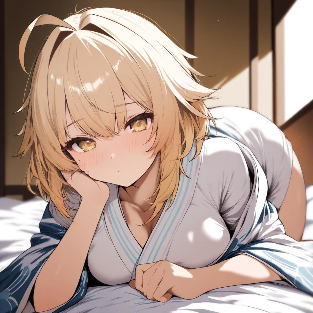 Illustration of an anime-style girl with brown hair, dog ears, and a tail lying on a bed. She wears a white top with a bone motif, a yellow jacket adorned with colorful bows, and has braided hair with a bone-shaped hair clip. The setting is a cozy bedroom with warm lighting and pillows.