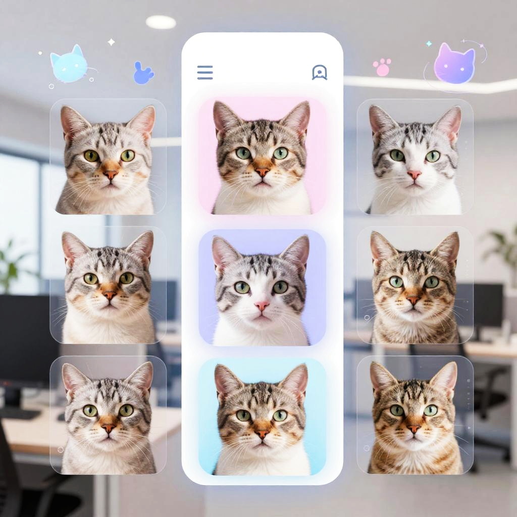Futuristic cat filter app UI mockup with transparent overlays of various cat expressions on diverse faces, vibrant pastel colors, high-tech digital aesthetics, in a modern workspace environment with holographic cat icons and playful animations.