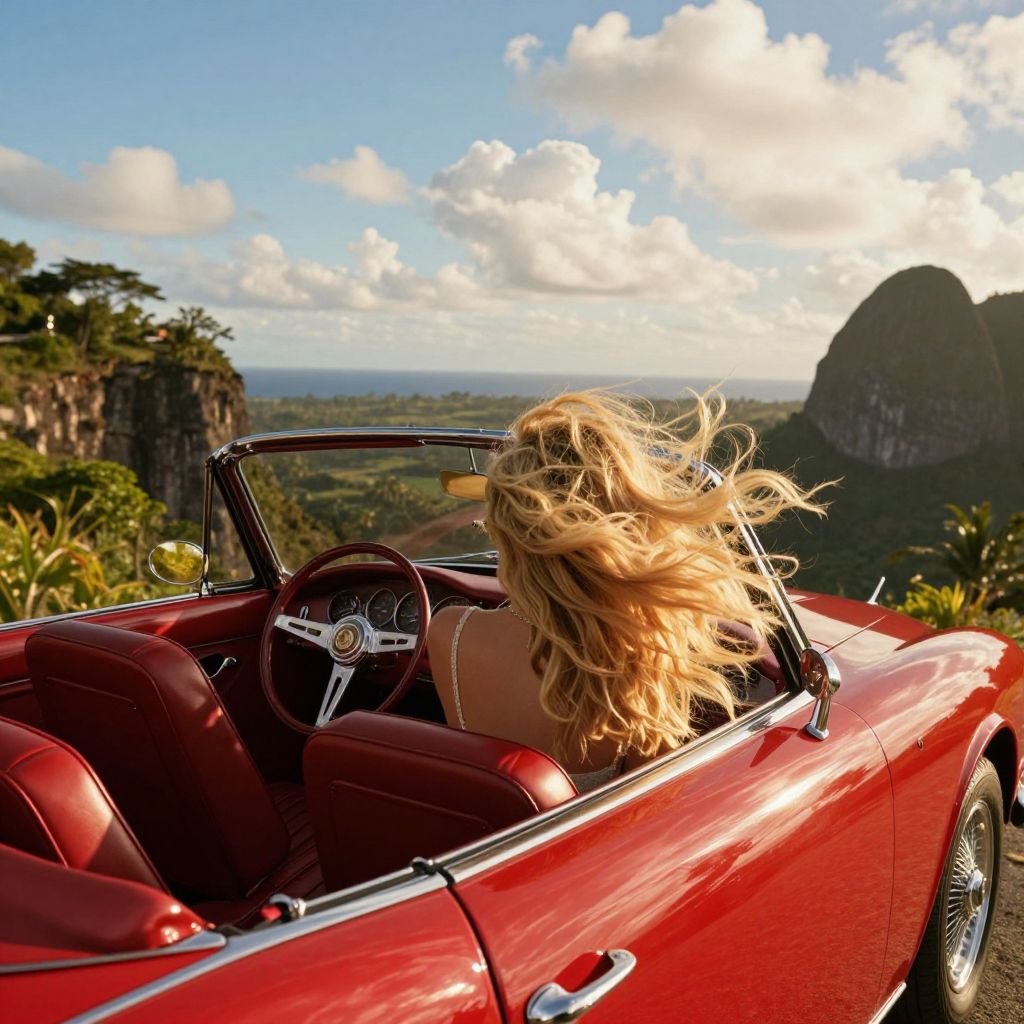 In this vibrant and dynamic scene, a woman with voluminous, golden blonde hair is driving a classic red convertible car on a high cliff overlooking a tropical paradise. The car's sleek design and polished finish reflect the sunlight, creating a radiant glow that enhances the rich, warm colors of the vehicle. The woman's hair, caught in the wind, adds a sense of motion and freedom to the image. The tropical landscape, with its lush greenery and towering cliffs, stretches out behind her, framed by the car's open top. The sky above is a brilliant blue, dotted with fluffy white clouds, casting a soft, diffused light that bathes the entire scene in a warm, inviting glow. The interplay of light and shadow, the rich textures of the car's leather interior and the woman's attire, and the dynamic composition of the image create a sense of anticipation and excitement, capturing the essence of a luxurious, sun-soaked holiday adventure.