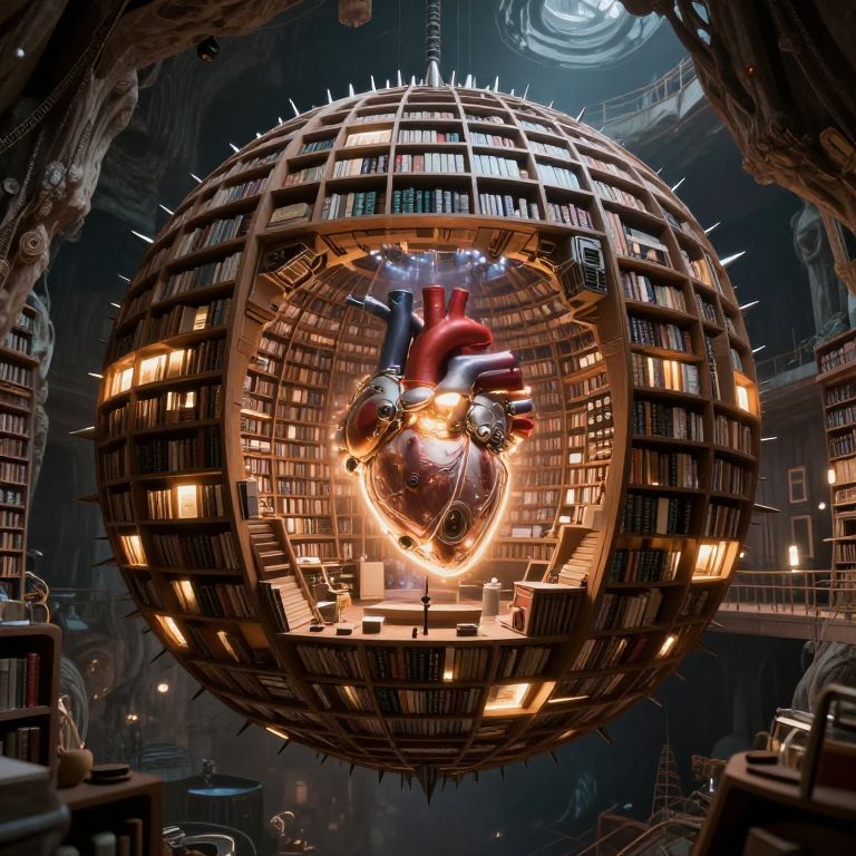 A colossal, spherical library suspended in a cavernous void, its spiky exterior encircling concentric rings of illuminated shelves, with a radiant, mechanical core pulsating like a living heart.