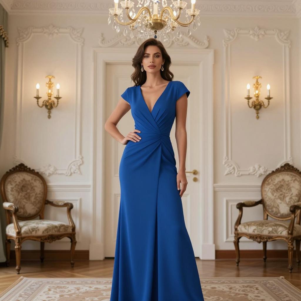 Navy evening dress sleeves, photorealistic portrait, young woman, standing, blue deep V-neck dress, short sleeves, elegant, brown hair in low bun, fair skin, subtle makeup, warm smile, sophisticated, ornate gold chandelier in background, large gold-framed mirror, window with white curtains to the left, wooden table with lamps and books, daytime, luxurious setting, soft natural light, realistic ures, classic European interior, mid-shot, high quality, realistic, detailed, refined atmosphere