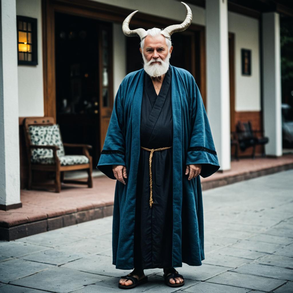 Evil grandma costume,1boy,solo,male focus,beard,facial hair,old,horns,old man,full body,robe,standing,sandals,blurry background,blurry