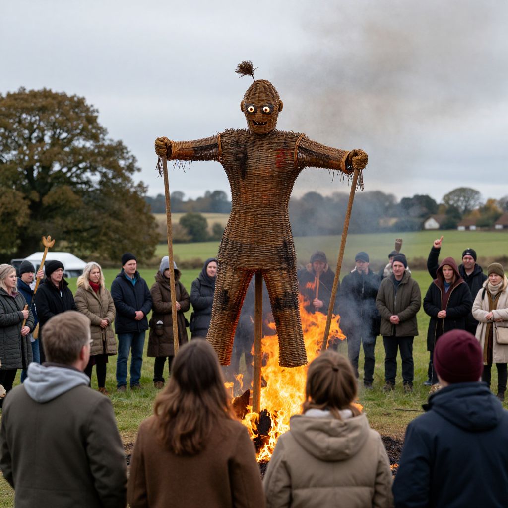 Photograph of a large, straw-man effigy burning in an open field, surrounded by a crowd of people in winter clothing.