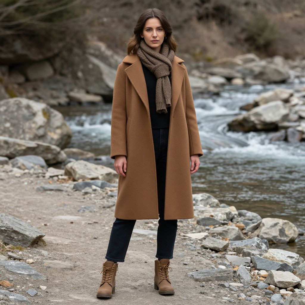 Photograph of a woman standing in a rocky, forested stream area. She has long, wavy brown hair and wears a tan, knee-length wool coat over black pants, paired with brown lace-up ankle boots and a brown, knitted scarf. Her expression is neutral. The background features a flowing stream with rocks and sparse vegetation. The image has a natural, outdoor setting with muted colors, emphasizing a rustic and autumnal atmosphere. The woman is centered in the frame, with the stream and rocks extending to the edges.