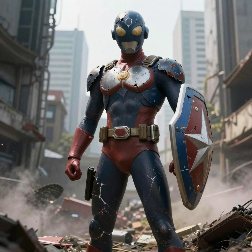 Realistic photo.a shattered hero, wearing a torn superhero costume, wielding a broken shield, standing in a dystopian cityscape, illustrated in the chaotic and visceral anime style of Tatsuki Fujimoto. realistic photo