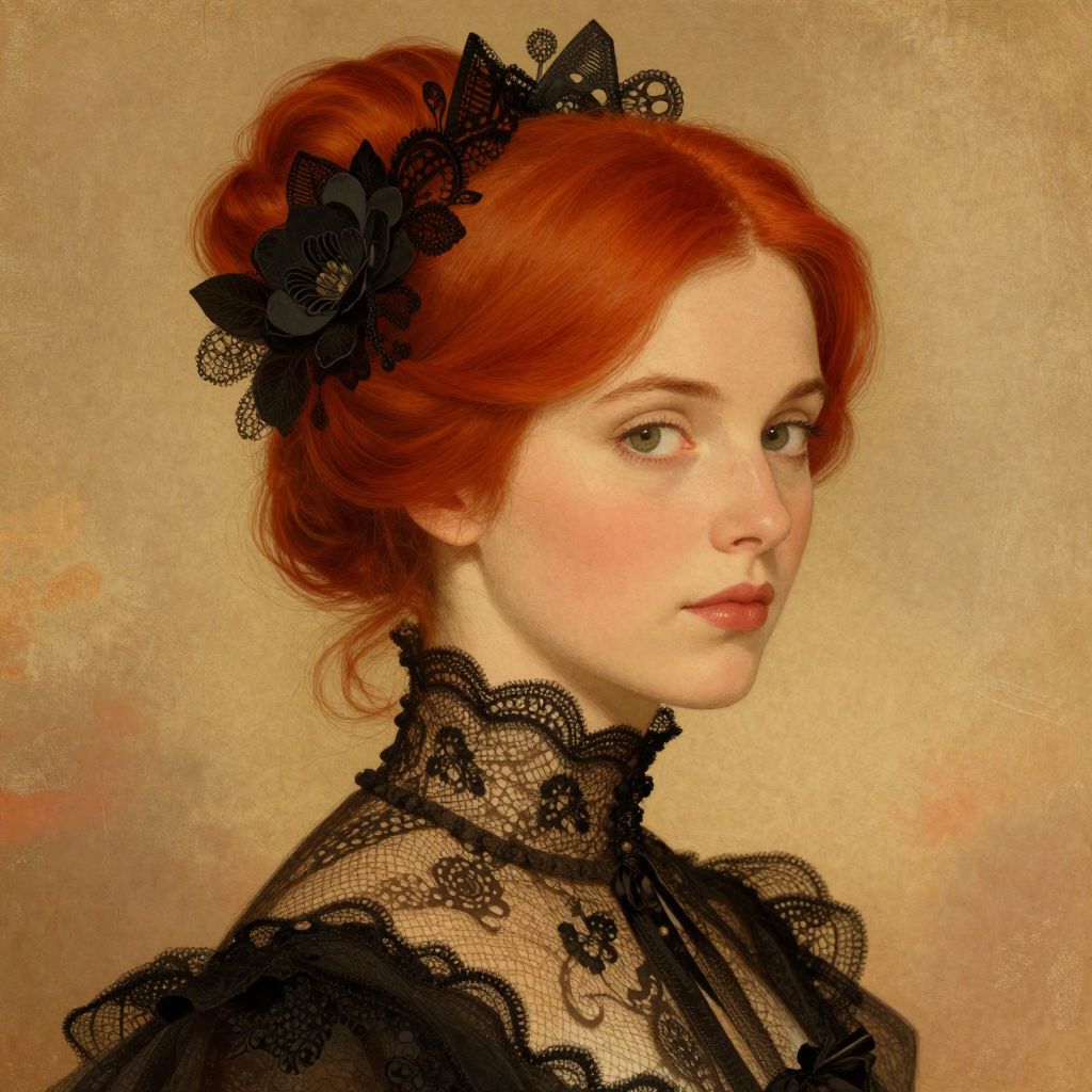 This is a digital painting of a fair-skinned, red-haired woman with delicate features and light green eyes. Her hair is styled in an elegant updo adorned with black lace flowers. She is wearing a black lace high-necked dress with intricate floral patterns. The background is a textured, warm beige with subtle gradients. Her expression is serene and slightly melancholic. The painting style is realistic with a slight vintage, Victorian influence, emphasizing the detailed lace and her gentle, ethereal beauty.