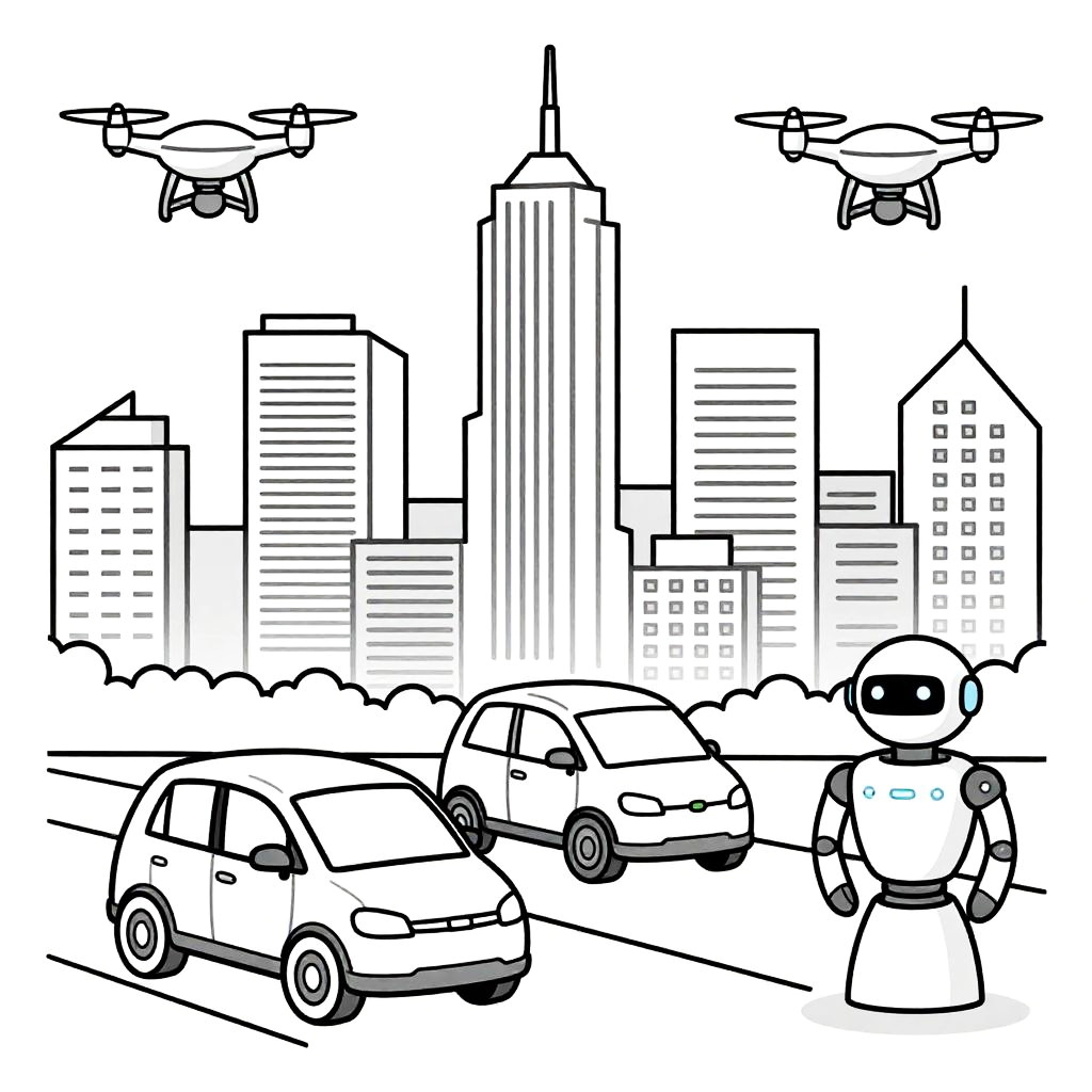 AI coloring page depicting a scene of a smart city powered by artificial intelligence, with sleek autonomous vehicles, drones, and AI-powered robots, all rendered in clear, bold lines and patterns, ideal for imaginative coloring activities.