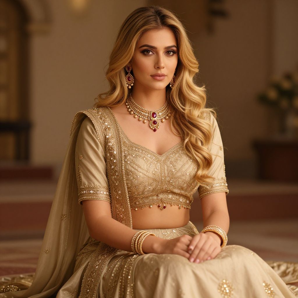 Meera bai costume, 1girl, solo, jewelry, necklace, sitting, blonde hair, realistic