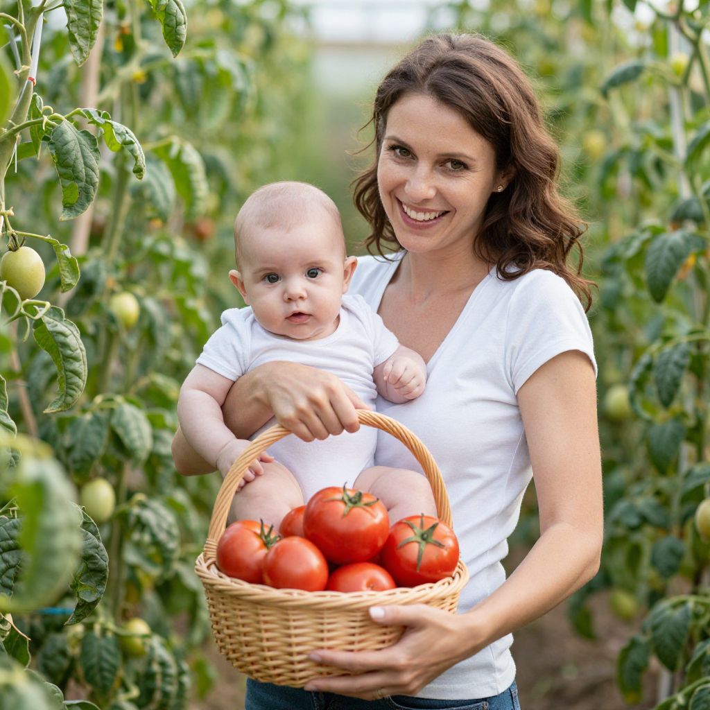 Photograph of a smiling Caucasian woman with long brown hair, wearing a white t-shirt and blue jeans, holding a basket of ripe red tomatoes in her left hand. She carries a bald, blue-eyed baby in a white onesie in her right arm. The background shows a lush, green tomato field with tall plants and visible tomatoes. The woman's skin is fair, and the baby's skin is also fair. Both are centered in the image, with the basket of tomatoes prominently featured in the foreground. The lighting is natural, highlighting the vibrant green of the plants and the red of the tomatoes.