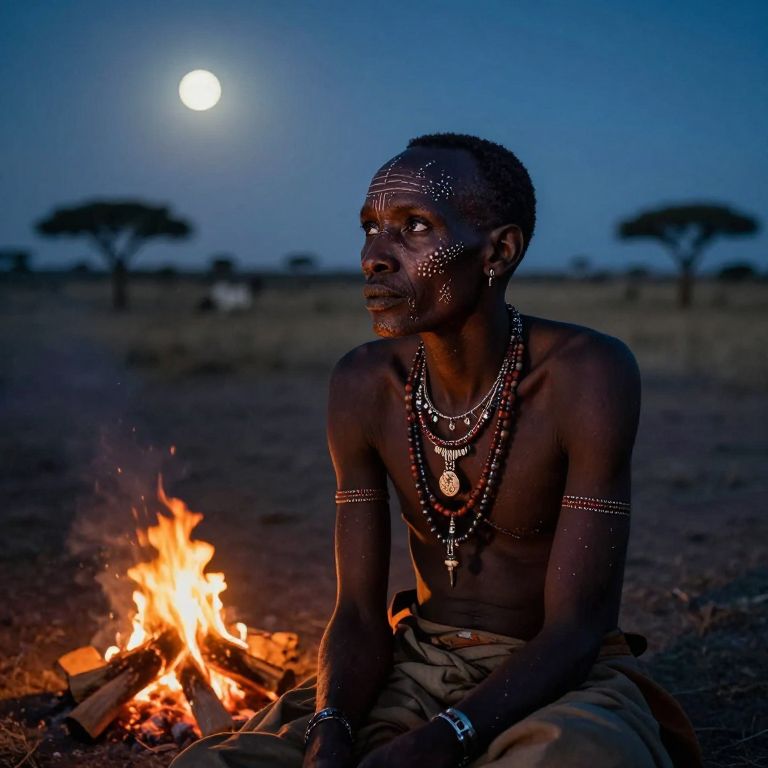 Photograph of a shirtless, dark-skinned African man with beaded jewelry, sitting by a campfire under a full moon in a savanna
