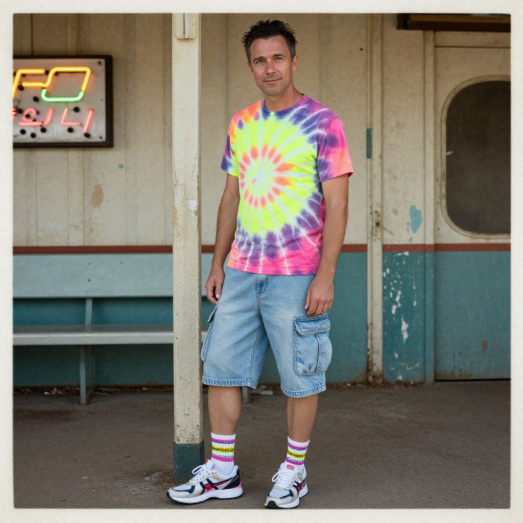A man, neon tie-dye short-sleeve shirt, cargo denim shorts, retro running shoes, patterned ankle socks, lightweight denim fabric, abandoned station with peeling paint, flickering neon sign, vintage photo style, relaxed smile, casual confidence. Man has masculine face and piercing eyes