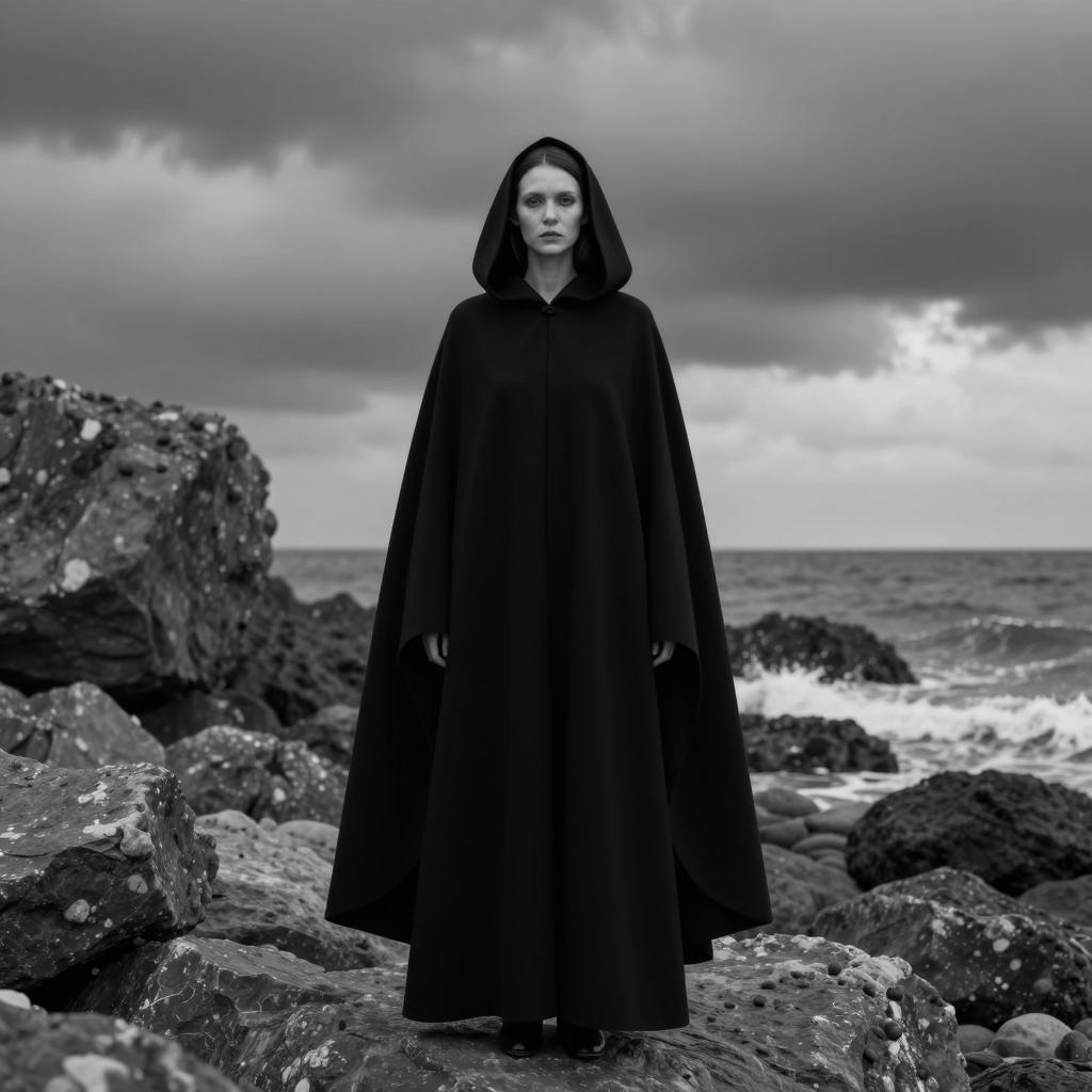 Black and white photograph of a pale-skinned woman standing on a rocky beach wearing a large black cloak with a hood. She has a blank expression and stands centered amidst large rocks with the ocean and a dark cloudy sky in the background.