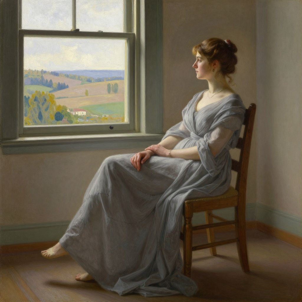 A woman dressed in a flowing gray gown sits gracefully on a wooden chair by a window, gazing out at a serene landscape bathed in soft natural light, rendered in the classic realism style characteristic of John George Brown's oil-on-canvas technique.