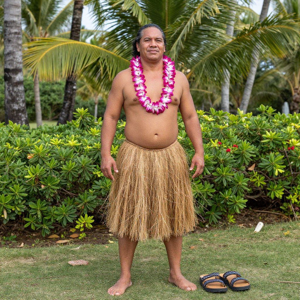 Man wearing a grass skirt with a lei around his neck and a pair of sandals on his feet. He is standing in front of a tropical area with palm trees and bushes.