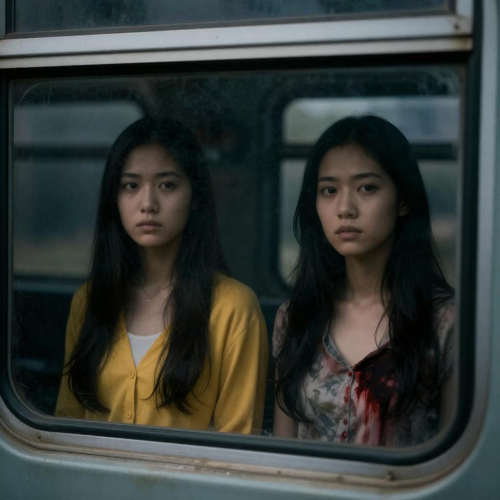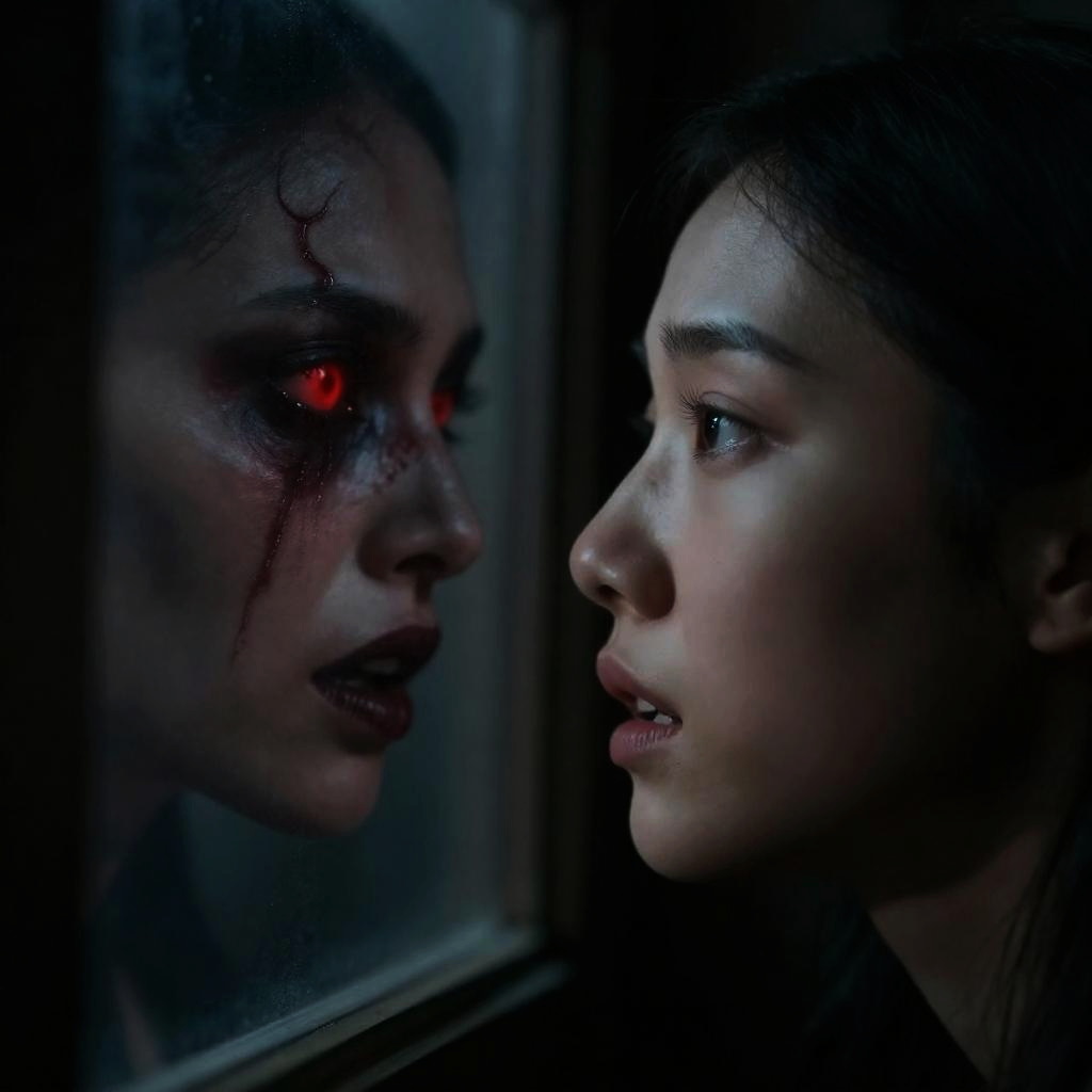Photograph of a dimly lit hallway. A woman with long dark hair, wearing a dark red dress, kneels in the center, eyes closed. Blood splatters on the walls. A shadowy figure with a cowboy hat stands in the background, silhouetted by light from a window. Blue-tinted lighting.