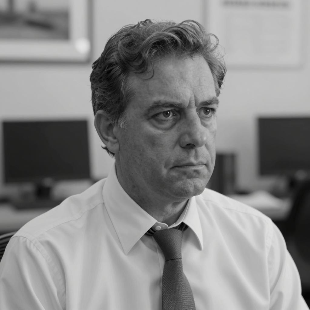 Middle-aged man with light-colored hair, intense expression, wearing a white button-up shirt, holding a piece of paper in his right hand. He is seated at a table with a writing desk in front of him. Background includes patterned wallpaper and a dark doorway. His left arm rests on the desk, which has a few visible items. The man is the only person in the image. The image has a black and white photographic style.
