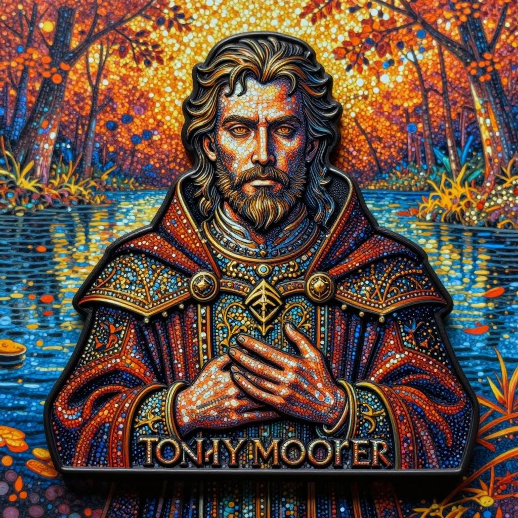 Line art trinket depicting a Minister of Impediments Tony Moore, natural, shimmering, vibrant, gothic, rpg, 1400ad, ultra detailed, detailed, immersive, reminiscent of high fantasy RPG games, HD, masterpiece, best quality, hyper detailed, super realistic, perfect face, perfect hands, award-winning, professional, breathtaking, linquiveraautumnal Lagoonheated weatherpointillism style . composed entirely of small, distinct dots of color