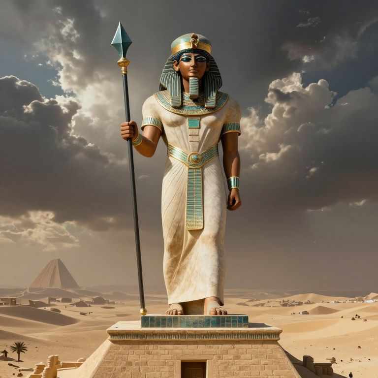 Digital artwork of an ancient Egyptian deity statue, standing in a desert with a pyramid in the background, holding a tall spear. Cloudy sky, sandy