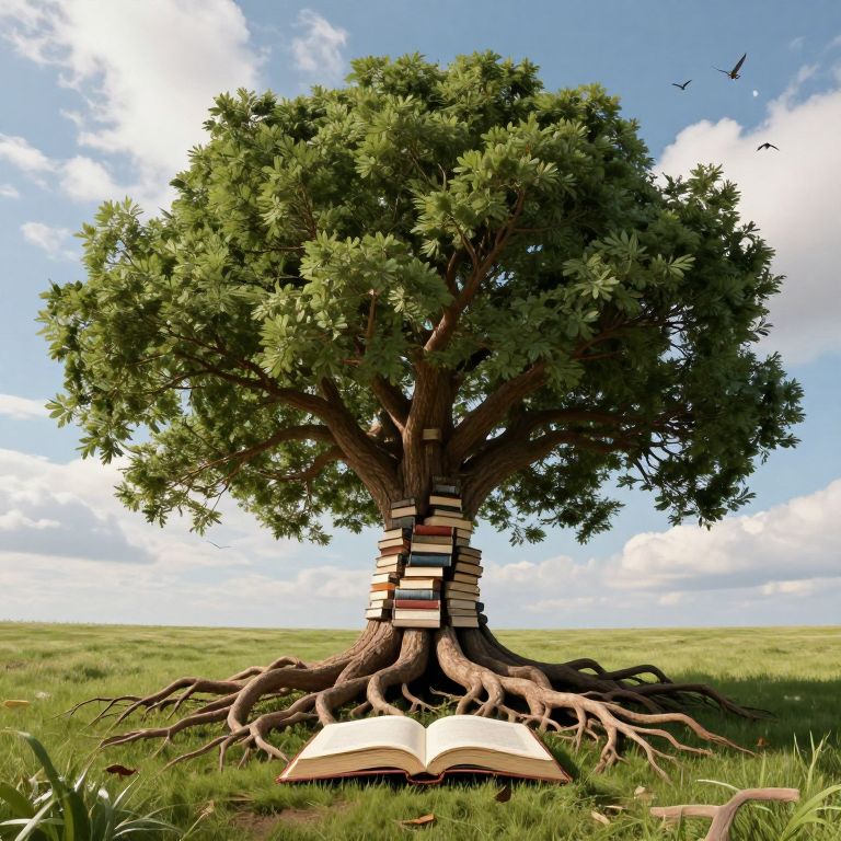 Enormous tree stands majestically with its trunk composed of stacked books, roots sprawling outward across the grassy field, and an open book resting beneath its branches, all under a serene sky dotted with fluffy clouds and soaring birds.