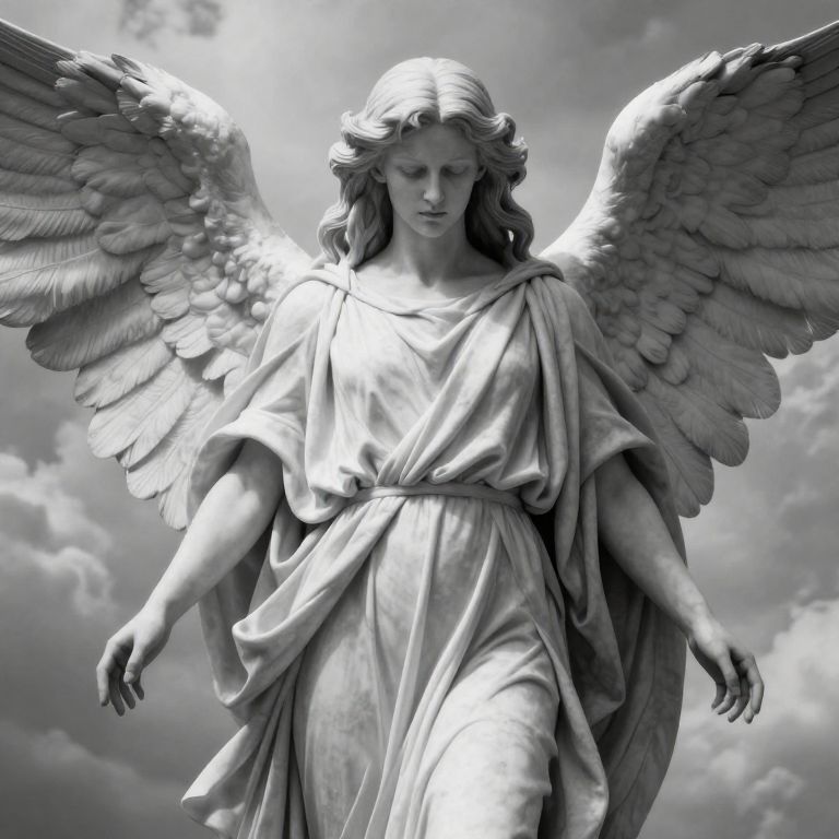 A black-and-white photograph of a classical angel statue with detailed, large wings and flowing hair. The angel wears a draped, classical robe that falls gracefully over her body. Her expression is serene, with a slight downward gaze. The wings are intricately feathered, and the statue is illuminated from above, creating a halo effect against a cloudy sky background. The texture of the statue is smooth, with subtle shading that highlights the contours of the robe and wings. The overall style is realistic and timeless, evoking a sense of tranquility and divinity.