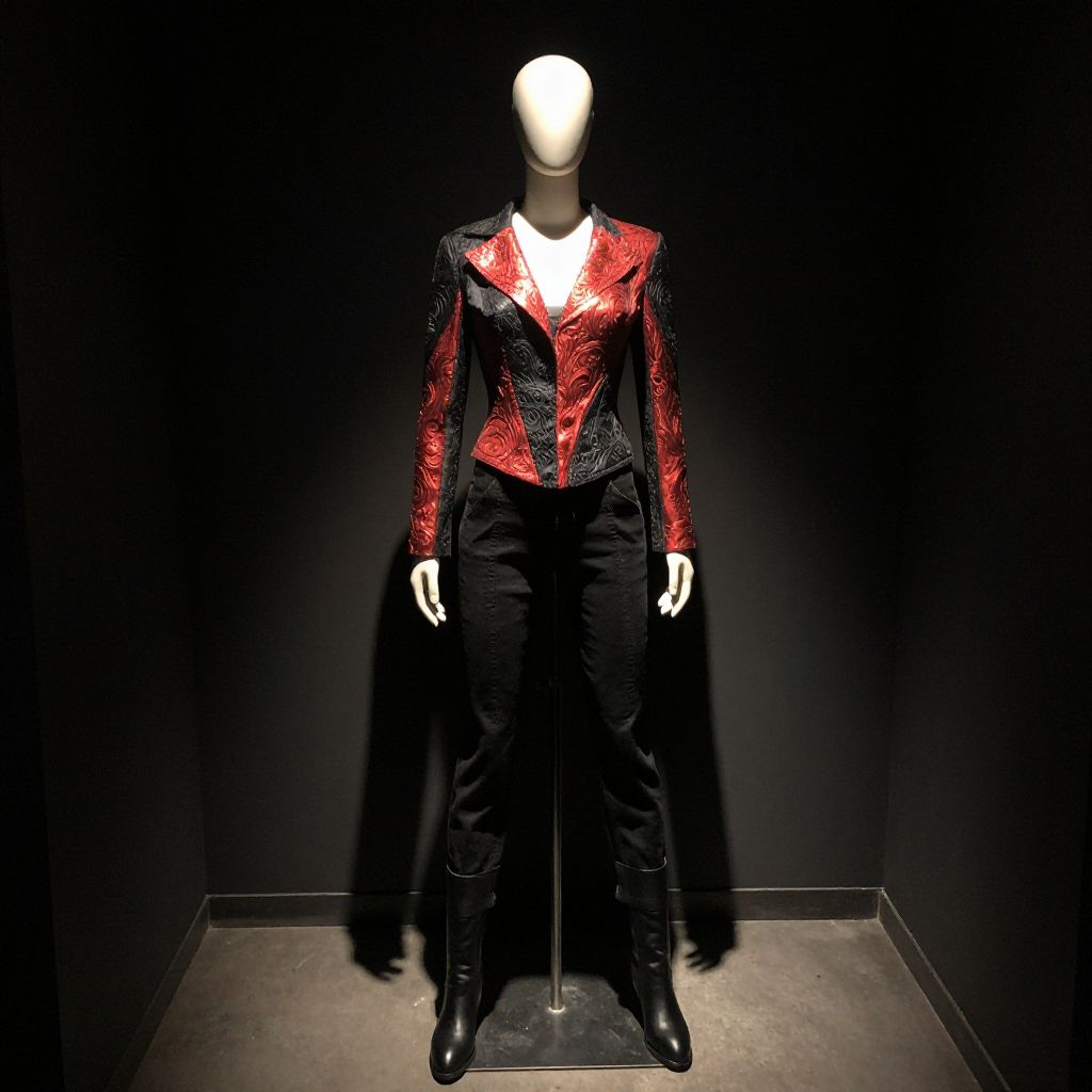 Photograph of a headless mannequin in a striking red and black sequined jacket with long sleeves, black pants, and black boots, against