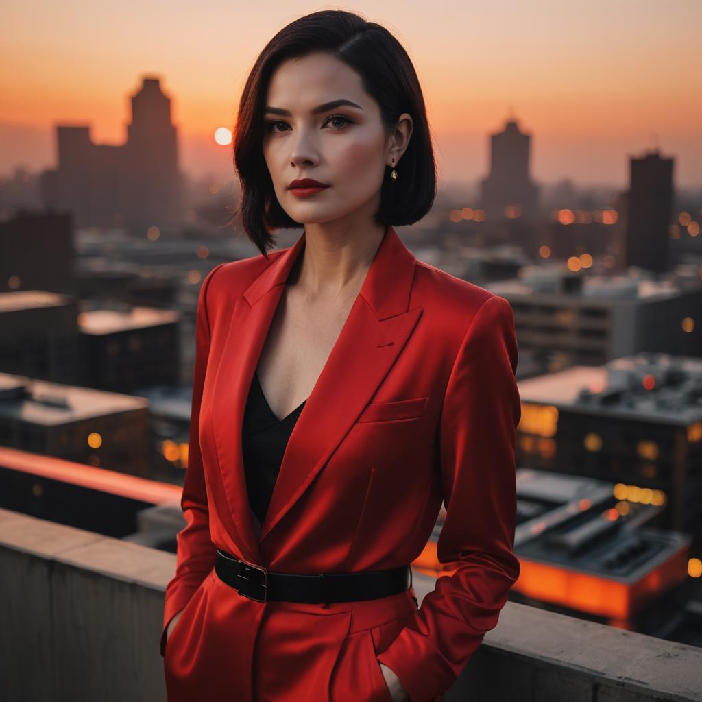 Photorealistic medium shot portrait of a stylish woman with sleek straight jet black bob haircut and bright red lipstick. She wears a tailored shiny red satin suit with a plunging neckline, standing confidently with hands in pockets on a concrete rooftop terrace. The background features a blurred city skyline silhouette under a warm orange gradient sunset sky, illuminated by soft golden hour lighting with a cinematic atmosphere.