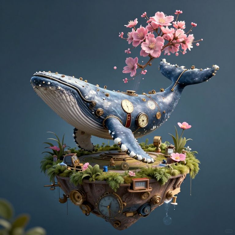 Whimsical CGI of a steampunk-style blue whale adorned with gears and flowers, floating on a grassy, flower-decorated island against