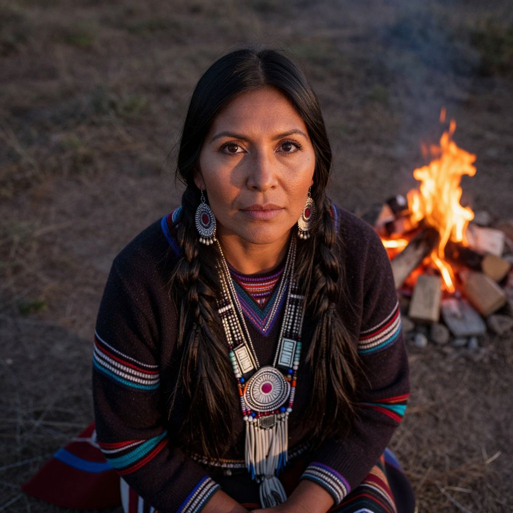 Visualize a photorealistic portrait of a Native American woman, captured from an aerial viewpoint just above her seated form. Her enigmatic gaze, with piercing dark eyes and flowing raven hair, is illuminated by the warm glow of a crackling fire at dusk. The dancing shadows across her serene face highlight intricate patterns on her handmade jewelry. This portrait evokes ancient wisdom and contemporary resilience, inviting viewers to uncover untold stories woven into her rich visage against a mesmerizing primordial landscape reclaimed by nature's tender caress.